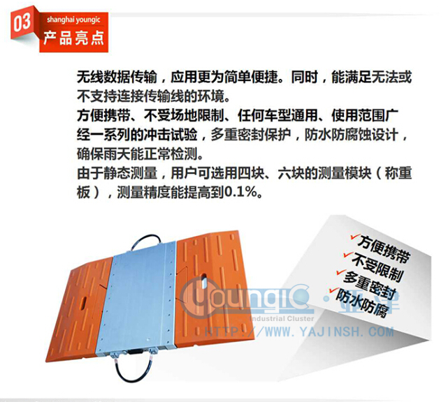 便攜式汽車衡稱重板精選超高強度鋁合金,外表面采用高品質軍工鋁氧化處理耐磨耐腐蝕,經一系列的沖擊試驗,多重密封保護,防水防腐蝕設計,確保雨天能正常檢測。重量輕,便于攜帶,精度高,重復性好,橫向一致性誤差小。帶有高強度電纜保護彈簧,不怕汽車車輪碾壓,腰型孔把手設計永不損壞。電纜信號插頭為進口件。高品質橡膠引坡表面雙重防滑花紋設計,做工精致美觀,堅固耐用,和稱重板燕尾槽連接,避免臺板和引坡脫開,整體式結構動態信號響應速度快,頻率高。