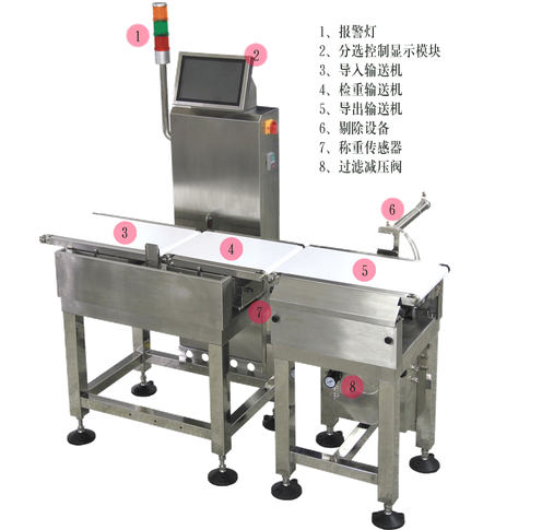 分選檢重秤以高速度之動態重量讀取方式檢出生產線上的產品之重量,可以精確的檢測出連續生產線中重量不合格的產品,并依此執行上下線判別或重量自動分選之控制,特別適用于包裝產品中的缺件檢查。包裝產品通過檢重秤稱重檢測,合格的送回原有輸送帶,不合格的予以剔除(或報警停機),并且具有根據設定對產品進行分類和統計等功能。可節省人力、提高效率,避免因包裝過量導致無謂之損失或因重量不足而引起之客戶抱怨,以提升客戶之滿意度,為自動生產線及包裝線上之最佳品檢設備。