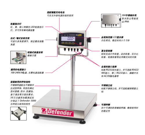 奧豪斯公司全新呈現的Defender 5000系列防水電子臺秤,擁有靜態稱重、檢重稱重、計件稱重(自動更新)、百分比稱重、動態稱重和顯示保持等功能,可被廣泛使用于食品、物流、包裝等領域。它全新的設計理念使其即使在潮濕、惡劣的環境下也能精準稱量。最大量程: 15kg到300kg 可讀性: 0.005kg到0.1kg